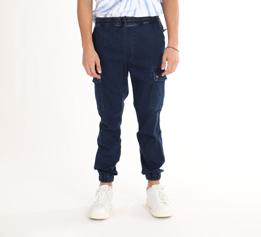 Pantalon coupe décontractée. Taille élastique réglable par cordon.Poches avant et poches à l’arrière. Application de poches plaquées à rabat sur les jambes.Chevilles élastiques.