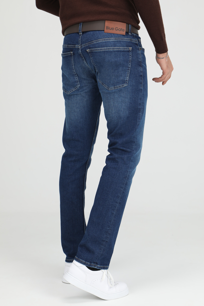 Jean coupe slim en tissu denim extensible. Cinq poches. Fermeture zip et bouton sur le devant.
